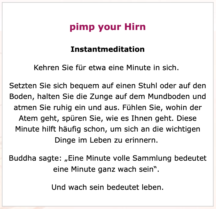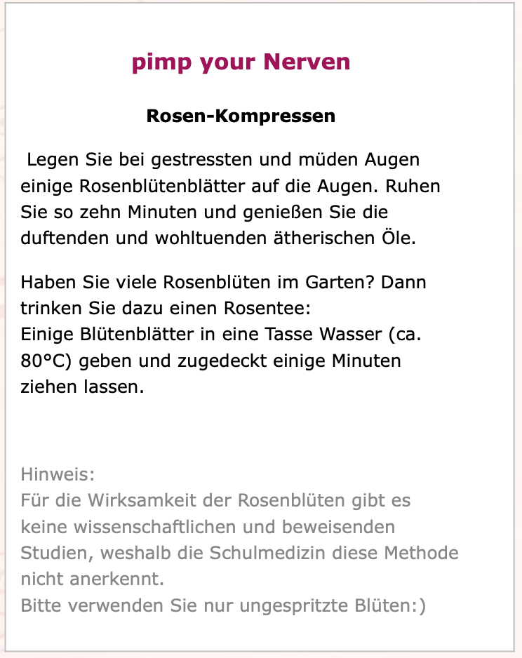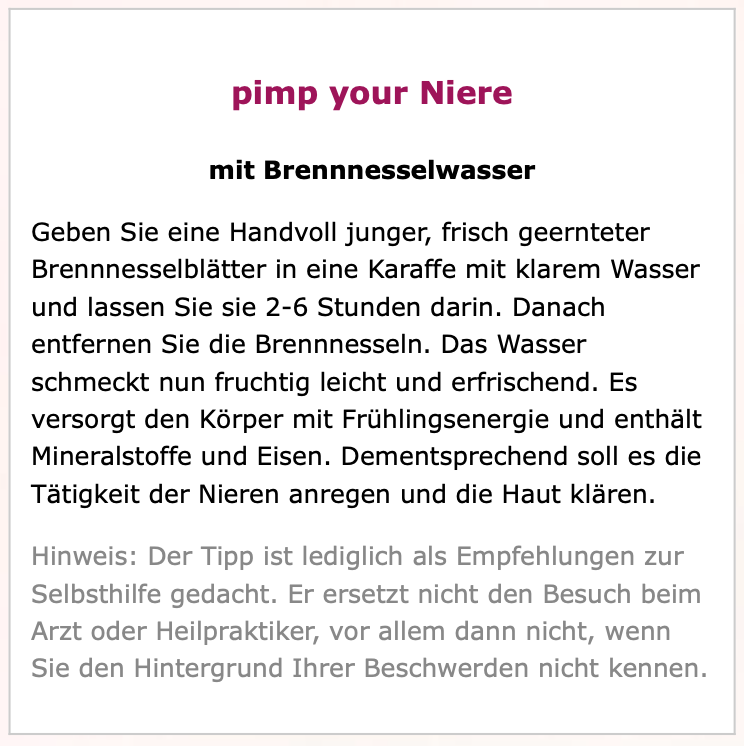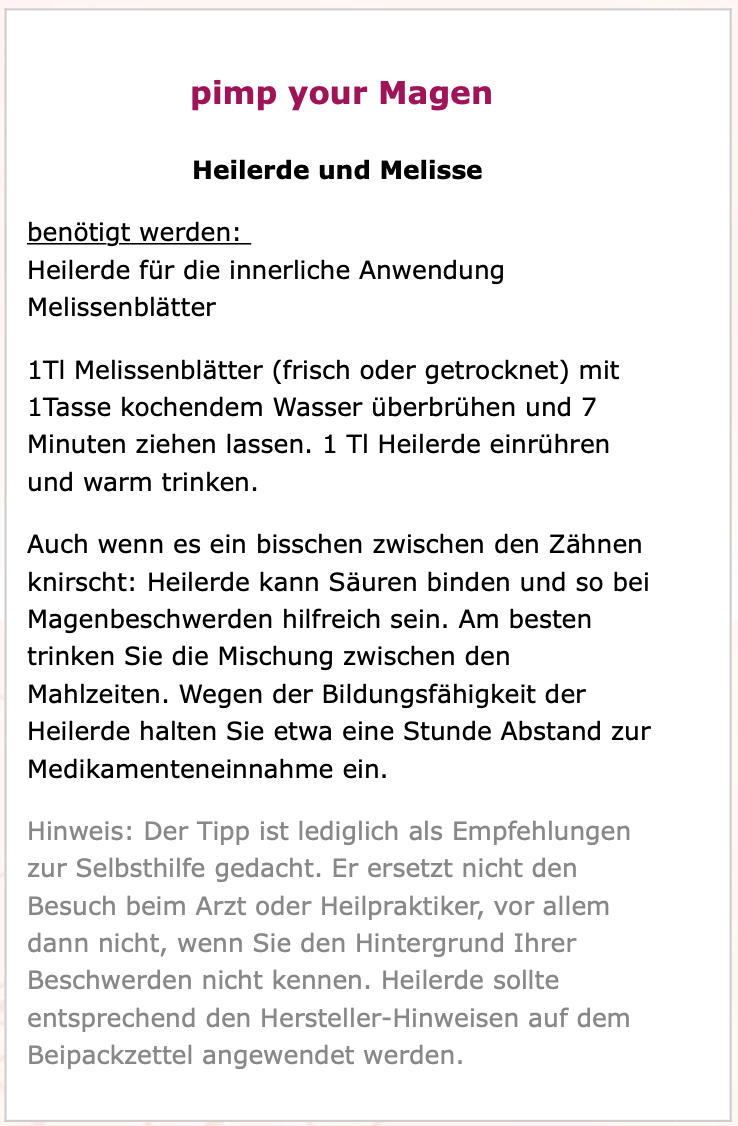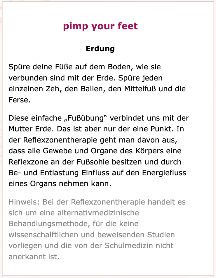 Letztendlich beruhen die hier aufgeführten Theorien und Anleitungen auf Erfahrungen einiger naturheilkundlicher Therapeuten und sind wirklich nur als Empfehlungen zur Selbsthilfe gedacht. Auf keinen Fall ersetzen sie den Besuch beim Arzt oder Heilpraktiker. Deshalb meine Bitte: Lass alle deine Beschwerden und Erkrankungen schulmedizinisch abklären, bevor du dich selbst behandelst.