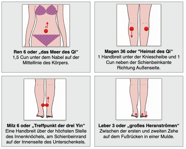 Um den blo­ckier­ten Ener­gief­luss, also die Qi-Sta­g­na­ti­on zu lösen, eig­net sich - nach der Lehre der Chi­ne­si­schen Me­di­zin - be­son­ders gut die Aku­punk­tur. Des­halb ist die Aku­punk­tur bei Re­gel­schmer­zen auch auf der In­di­ka­ti­ons­lis­te der 'Deut­schen Aku­punk­tur Ge­sell­schaft' auf­ge­führt.